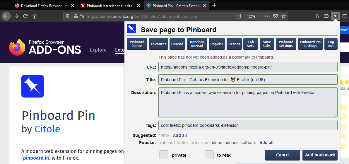 Pinboard Pin is a web extension for pinning pages on Pinboard with Firefox.